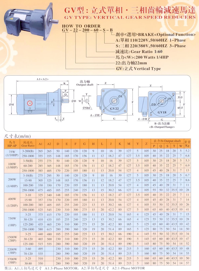 GV立式齒輪減速電機(jī)的型號(hào)表示方式,GV立式小齒輪減速機(jī)馬達(dá)的外形尺寸表,具體型號(hào):GV18,GV22,GV28,GV32,GV40,GV50;可配電機(jī)功率:75W(1/10HP),100W(1/8HP),200W(1/4HP),400W(1/2HP),750W(1HP),1500W(2HP),2200W(3HP),3700W(5HP)